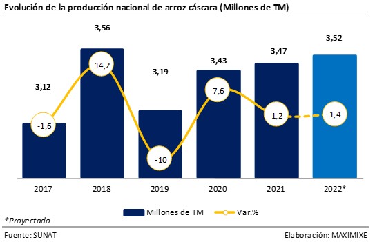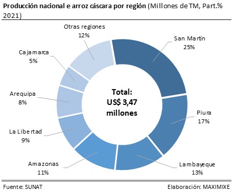 La producción nacional de arroz en cáscara aumentó 1,2% en 2021, lo que representó la producción total de 3,47 millones de TM de arroz. Las regiones con mayor fueron San Martín (25% del total producido), Piura (17%), Lambayeque (13%) y Amazonas (11%). En contraste, las importaciones de arroz disminuyeron hasta 233,4 miles de TM lo que representó una caída de 26,1%: Por otro lado, las exportaciones registraron una estrepitosa caída de 97,9% en 2021 (954 TM).