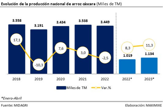 Para el año 2023 se prevé que la producción nacional de arroz en cáscara ascendería a un total de 3,5 millones de TM; lo que representaría un crecimiento en términos de volumen del 1%. Este resultado sería explicado debido al mayor incremento de la siembra en regiones no costeras, principalmente en los departamentos de San Martín, Arequipa y Amazonas; el incremento de las lluvias productos del Fenómeno de El Niño; y a un incremento de la demanda del rubro restaurantes (Horeca). Asimismo, existen pperspectivas favorables sobre el incremento de los precios del arroz en chacra que impulsarían la siembra de arroz.
