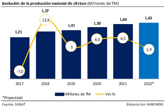 La producción nacional de cítricos alcanzó los 1,6 millones de TM de cítricos al cierre de 2021, y registró un incremento del 6,5% frente a lo registrado en 2020. Los cítricos con mayor participación fueron: la mandarina con el 36,8% del total producido; la naranja participa con el 35,9%; y el limón con el 20,2%; los demás cítricos acumularon el 6,8%. Por otro lado, las exportaciones de cítricos alcanzaron los 262,8 miles de TM lo que representó una caída de 0,2%; mientras que en términos de valor se alcanzaron los US$ 260 millones y una disminución de 6,2%. Para 2022 se estima que la producción nacional de cítricos alcance los 1,63 millones de TM; lo que representaría un crecimiento de 1,9%. Este resultado sería explicado por la sostenida tendencia positiva en la demanda de frutas y hortalizas por parte de los consumidores nacionales, sumado a las reservas de alimentación que poseen los suelos agrícolas de años previos de fertilización eficiente (principalmente de la región Lima). Respecto a las exportaciones, se alcanzaría los 247,8 miles de TM, lo que representaría una caída de -5,7%, debido a los actuales desafíos del mercado, tales como el aumento de los costos laborales, insumos agrícolas, fletes y las interrupciones logísticas.
