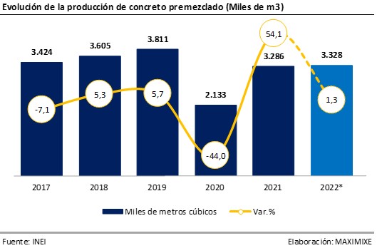 Para el 2022 se prevé que la producción de concreto premezclado alcance un total de 3.328 millones de m3; lo que representaría un crecimiento en volumen de 1,3%, producto de la continuación en la ejecución de proyectos de infraestructura, como la Línea 2 del Metro de Lima, la ampliación del Aeropuerto de Lima, entre otros; sumado al desarrollo de programas de viviendas por parte del gobierno y la autoconstrucción. Asimismo, espera que el gobierno logre disipar el ruido político e mejorar la ejecución de la inversión en infraestructura; de lo contrario, la continua alza de los materiales de construcción menguaría la demanda de adquisición de viviendas y la autoconstrucción.