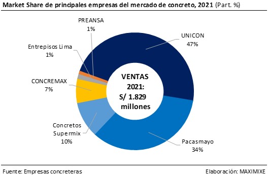 En el 2021, la producción de concreto premezclado aumentó 54,1% representando la producción total de 3.286 millones de m^3 de concreto; sin embargo, cayendo ligeramente en 4,6% frente a lo registrado en 2019. Las empresas concreteras con mayor participación en la producción de concreto fueron UNICON (47%), Pacasmayo (34%), Supermix (10%), y Concremax (7%). De igual manera, la producción de concreto prefabricado como bloques de concreto crecieron hasta 4.388 miles de unidades representando un incremento de 63,2%; mientras los adoquines crecieron a 24.000 millares, evidenciando un crecimiento de 35% en 2021.