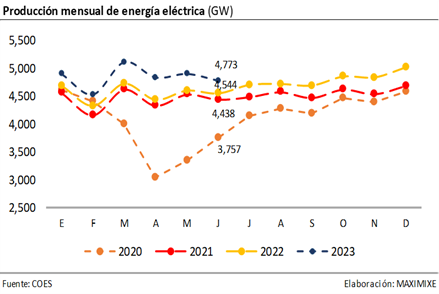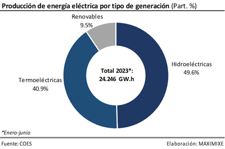 La producción de energía eléctrica alcanzó los 29.019 GW.h, entre enero y junio 2023, registrando un crecimiento de 6,3%, frente a similar periodo del año anterior; impulsado por el crecimiento de la producción total de centrales de generación termoeléctrica (32,5%) y renovables (1,9%); atenuado por, la reducción de la producción hidroeléctrica (-7,9%), esto último resultado de los primeros efectos del FEN.