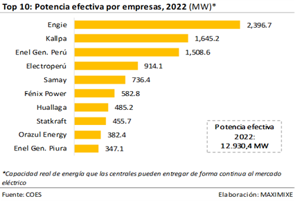 Al cierre del 2022 la producción eléctrica mantuvo la siguiente estructura: el 50,8% fue generado por las centrales hidroeléctricas, el 44,3% fue de origen térmico y el 4,9% fue generado a través de energía eólica o solar; asimismo, cinco empresas concentraron el 63,4% de la producción total, liderados por Kallpa (18,4%), Engie (12,7%), Enel (12,6%), Electroperú (12%) y Fénix Power (7,7%).