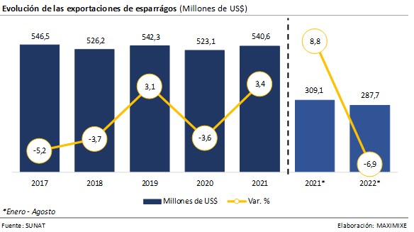 Durante el avance enero-agosto 2022 las exportaciones de espárragos alcanzaron los US$ 287,7 millones y cayeron 6,9% al compararlo con el mismo periodo del año anterior. El producto de mayor demanda son los espárragos frescos (70,2%), alcanzando ventas por US$ 202 millones, seguido de espárragos en conserva con US$ 63,3 millones (22%) y espárrago congelado con US$ 22,4 millones (7,8%). Los envíos al exterior de espárragos frescos se concentran en EE.UU. por US$ 127,2 millones registrando una participación de 63%; seguido de Países Bajos con US$ 23,2 millones (11,5%) y Reino Unido con US$ 18,3 millones (9,1%), mientras que los envíos de espárragos en conserva se concentran en España por US$ 21,8 millones (34,5%); Francia con US$ 12,5 millones (19,7%) y EE.UU. con US$11,6 millones (18,3%). Por otro lado, Danper Trujillo lidero las exportaciones de espárragos fresco con US$ 23,7 millones; mientras que, Viru las exportaciones de espárragos en conserva con US$ 24,5 millones; según el último informe de mercado de Espárrago de MAXIMIXE.