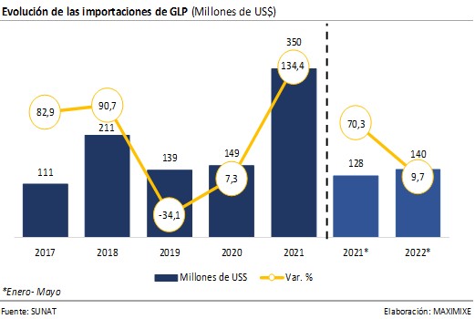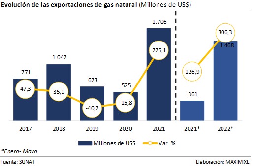Durante el avance enero-mayo 2022 la exportación de gas natural acumuló US$ 1.468 millones y creció 306,3% al compararse con el mismo periodo del año anterior, según el último informe de Mercado de “GN y GLP” de MAXIMIXE. Durante este periodo resaltaron los envíos a China que crecieron 286,5%, alcanzando los US$ 125 millones. El 36,5% del gas natural fue exportado al Reino Unido, siendo la empresa Perú LNG quien lideró las exportaciones, con un valor exportado de US$ 1.467 millones. En relación con el valor de las importaciones del GLP, estas alcanzaron los US$ 140 millones y crecieron 9,7%. El producto con mayor valor importado fue el propano, concentrando el 68,4% de participación (US$ 96 millones). El 55,9% de GLP importado proviene de EE.UU. (US$ 78 millones), siendo la empresa Solgas quien lideró las importaciones (US$ 59 millones), con una participación de 41,7%. Por otro lado, la producción fiscalizada de gas natural en el periodo enero – abril 2022 creció 23,3% al compararlo con similar periodo del 2021, alcanzando los 157 millones de pies cúbicos.