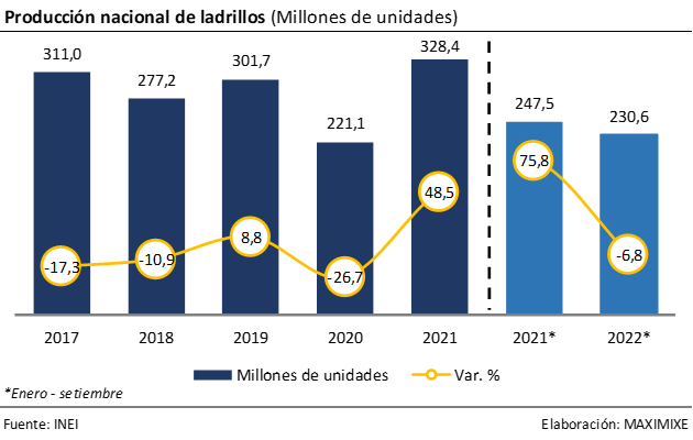 La producción nacional de ladrillos registró un crecimiento de 48,5% en 2021; sin embargo, a setiembre 2022, la producción descendió 6,8% respecto al mismo periodo del 2021 debido al alto nivel de ruido político y la postergación o descarte de proyectos residenciales, así como el retraso en la ejecución de obra pública, lo cual habría generado un menor dinamismo en la ejecución de obras privadas y públicas en el 2022 y también afectaría durante el primer trimestre de 2023. Por otro lado, la autoconstrucción de desaceleraría debido a la normalización de los hábitos de gasto de las familias ante la menor disposición individual del fondo de la AFP.