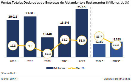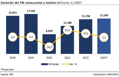 En ese mismo contexto, el país es actualmente uno de los principales destinos gastronómicos a nivel internacional, contando con “Restaurante Central” como primer restaurante en "The 50 BEST restaurants 2023" por la revista británica "Restaurant Magazine”, abriendo nuevas posibilidades de inversión y negocios en el sector. Sin embargo, este resultado se vería menguado por los continuos episodios de conflictividad social y el ruido político que sigue afectando al país, generando la cancelación o postergación de vuelos nacionales, y reduciendo el ingreso de turistas extranjeros al país.
