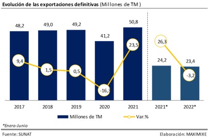 Por otro lado, al primer semestre de 2022, el volumen de las exportaciones definitivas e importaciones para el consumo cayeron -3,2%, frente al 6,3% de crecimiento registrado el año anterior. Las exportaciones e importaciones han mostrado un crecimiento promedio anual alrededor del 3% entre 2016 y 2021, (2,9% y 3,3% respectivamente).