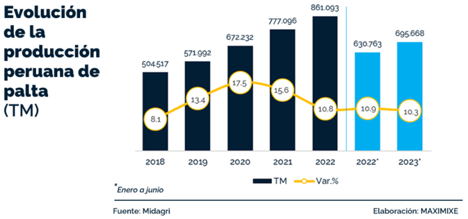 Al primer semestre de 2023 la producción nacional alcanzó las 696 mil TM y creció 10,3%, frente a similar periodo del año anterior; donde las regiones de La Libertad, Lima y Lambayeque concentraron el 64% de la producción nacional; informó la Consultora MAXIMIXE en su último Estudio del Mercado de Palta 2023.